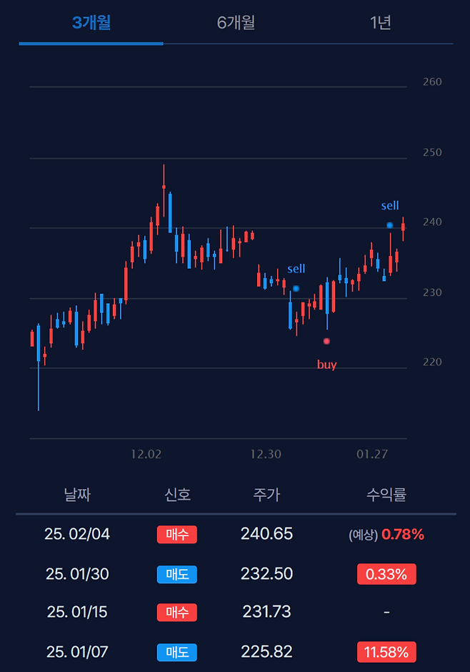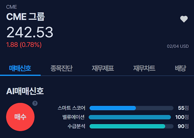 MK시그널에 따르면 CME 그룹은 지난 25년 2월 4일 240.65 달러에 매수 신호가 포착됐습니다.