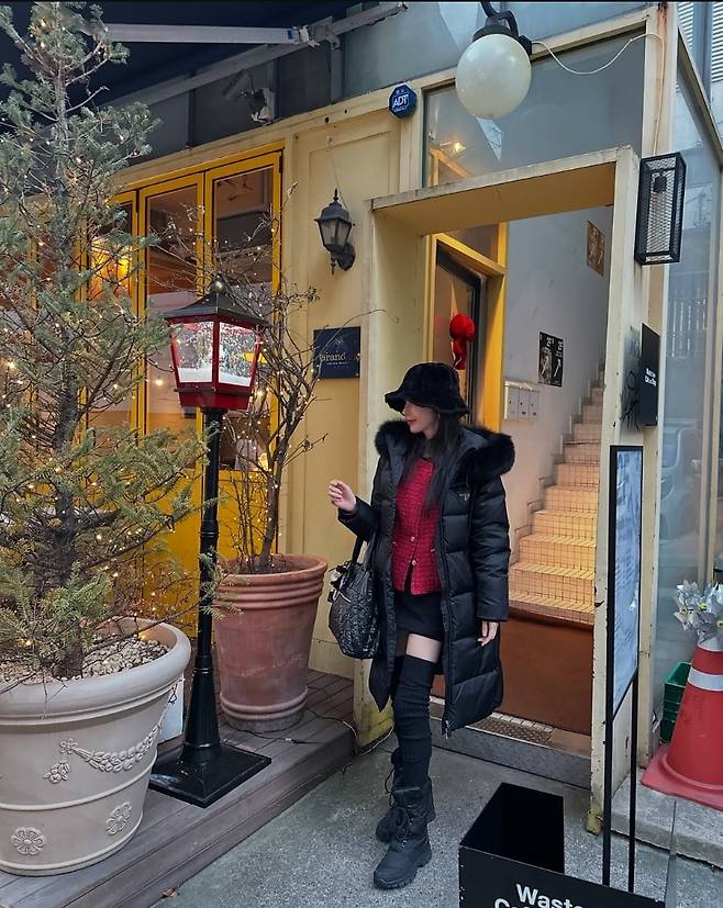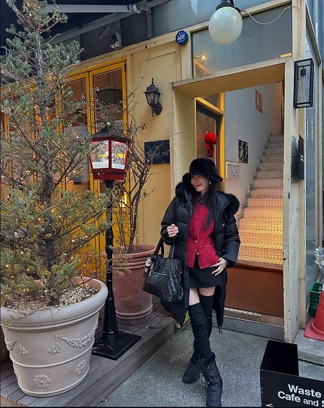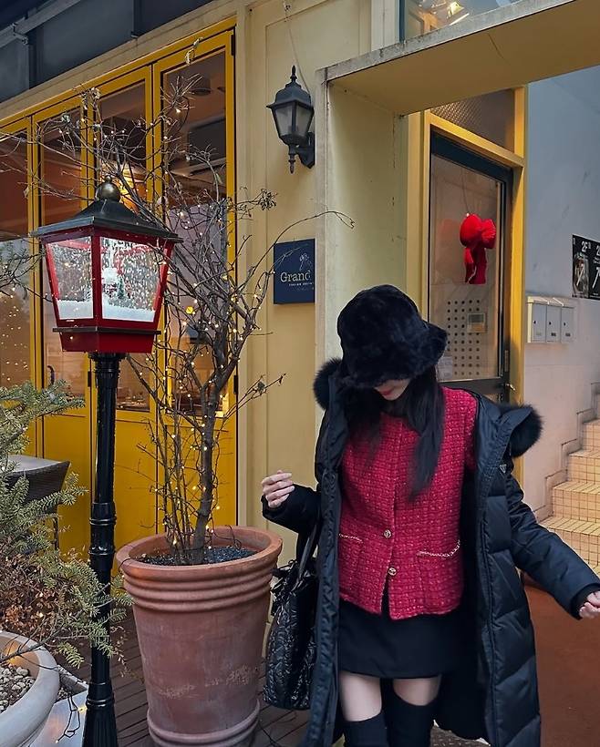신주아는 레드 트위드 재킷에 롱패딩을 매치하며 우아함과 실용성을 동시에 챙겼습니다.