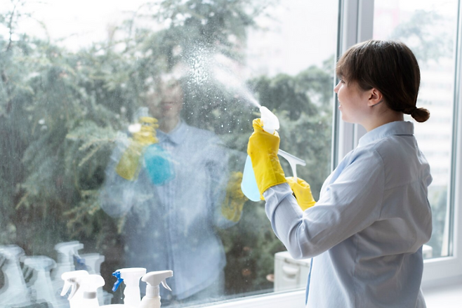 분무기에 식초와 물을 1:1로 섞어 뿌리고 닦으면 유리창의 물때와 얼룩을 쉽게 제거할 수 있다.