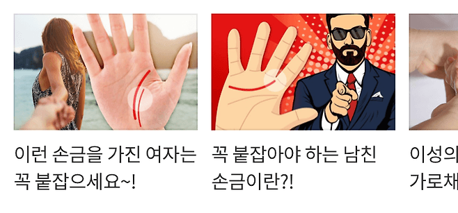 본인 역시 뛰어난 재능이나 어느 정도의 사회적 지위를 가지고 있을 가능성이 큰 손금이에요. 하지만 좋은 손금이 있더라도 아무것도 하지 않으면 의미 없다는 사실! 사람이 많이 모이는 동호회나 모임 등에 참석하여 당신의 왕자님, 공주님을 찾아보세요~