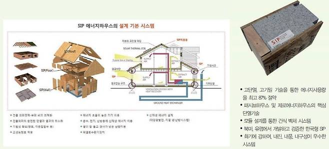 SIP는 구조용 합성목재(OSB)를 양면에 두고 그 안에 고성능 단열재(Insulation)를 합지 및 일체화시킨 패널로써, 공장 생산을 통한 고품질 실현과 에너지 사용량을 획기적으로 줄여주는 고단열 고성능 패널이다. 시공 시 기밀 테이프와 우레탄폼 충진 등 고기밀 정밀 시공이 가능하므로 고성능 저 에너지 건축물에 최적의 패널이다.