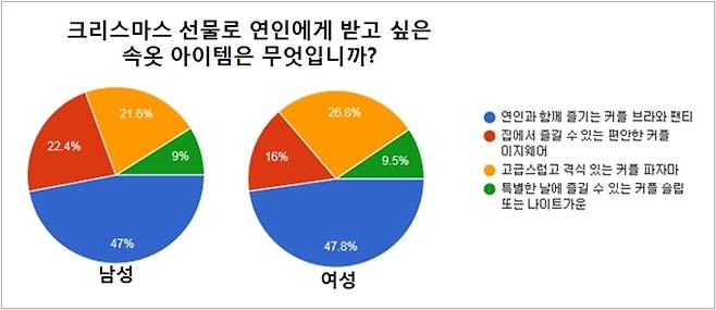 남성과 여성 모두 크리스마스에 받고 싶은 속옷 아이템으로는 커플 브라와 팬티가 1위로 뽑혔다. 남성 응답자 47%, 여성 응답자 47.8%로, 응답자의 절반에 가까운 수가 ‘커플속옷’을 선택했다.