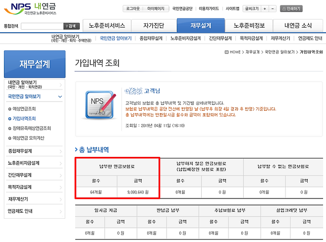 국민연금공단의 내연금 사이트에 접속한 후 재무설계 > 국민연금 알아보기 > 가입내역조회를 클릭하면 지금까지 납부한 연금보험료와 가입월수를 알 수 있습니다. 공인인증서로 로그인만 하면 바로 납부내역을 조회할 수 있답니다.