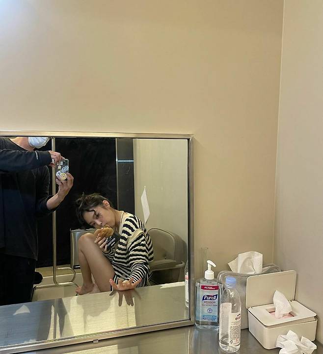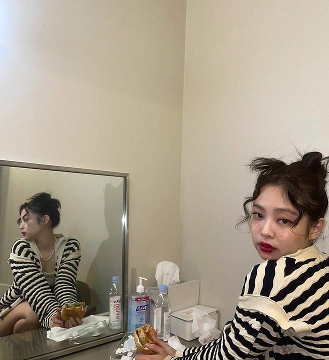 제니는 촬영 대기실로 보이는 곳에서 사진을 찍었다.