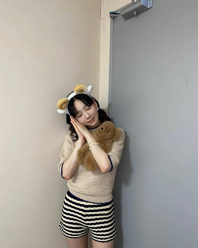 태연은 짜임새 있는 베이지 컬러의 반팔 니트를 착용했다.