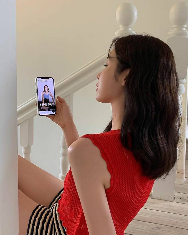 첫 번째 사진 속 차정원은 강렬한 레드 컬러의 니트 슬리브리스와 스트라이프 쇼츠를