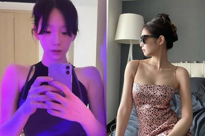 사진 속 태연은 머리를 올려묶고 민소매를 착용하고 여리여리한 어깨를 드러냈습니다. 90도 직각으로 뚝 떨어지는 어깨라인이 드러나 시선을 사로잡고 있습니다.