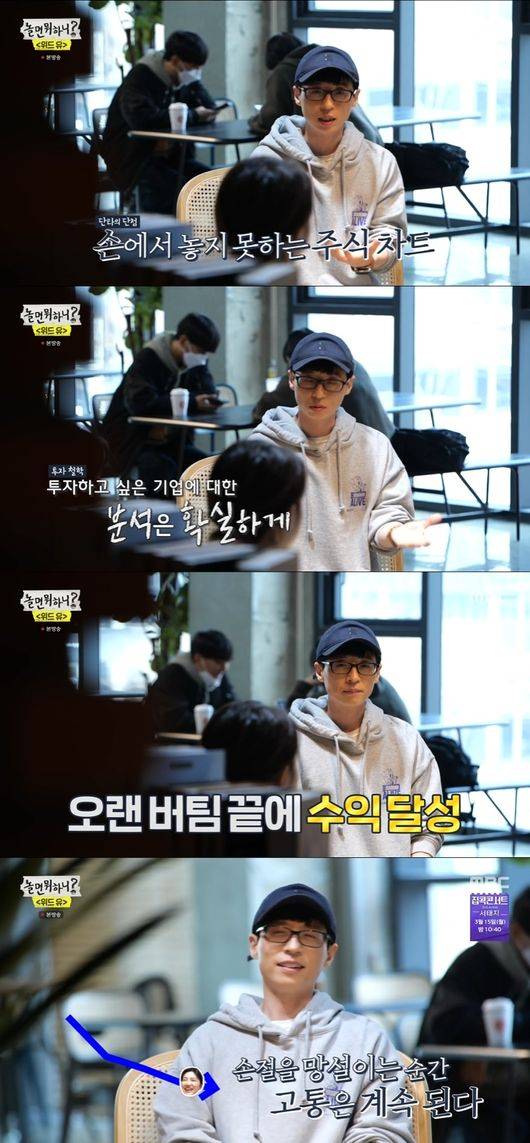 특히 유재석은 “나는 장기투자 위주로 한다. 시작할 때 괜찮았다. 수익도 많이 냈는데 갑자기 상황이 안 좋아지면서 급락을 했다. 손절 대신 버티기를 했고, 수익을 내고 팔았다”고 밝혔다.