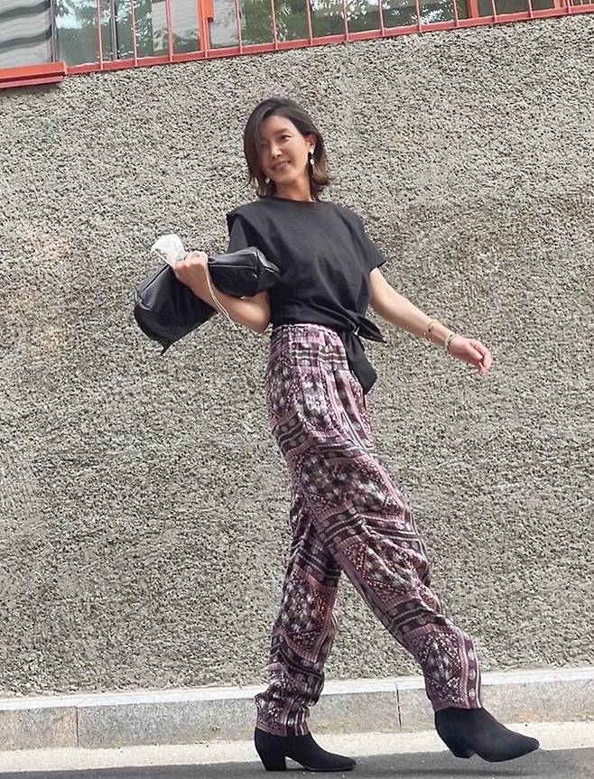 화려한 패턴 몸빼바지에 블랙 티셔츠와 클러치백 매치한 뛰어난 패션 센스 공개