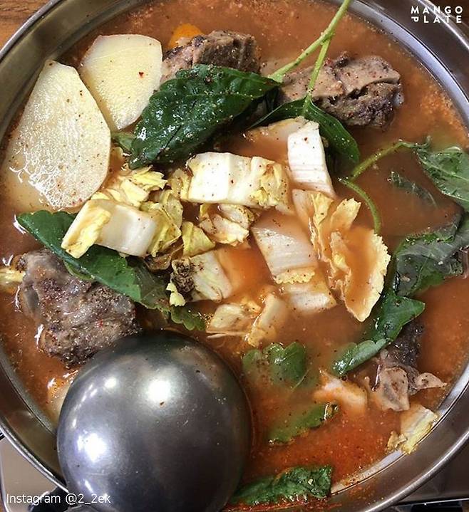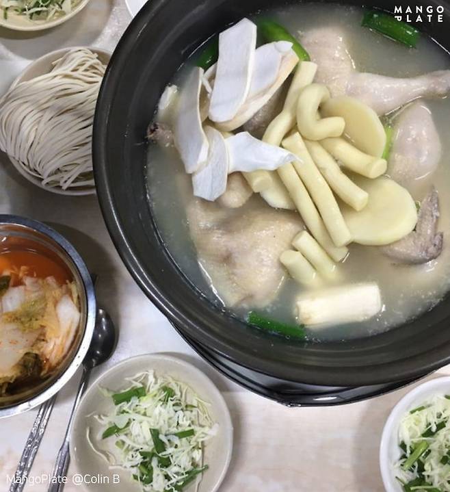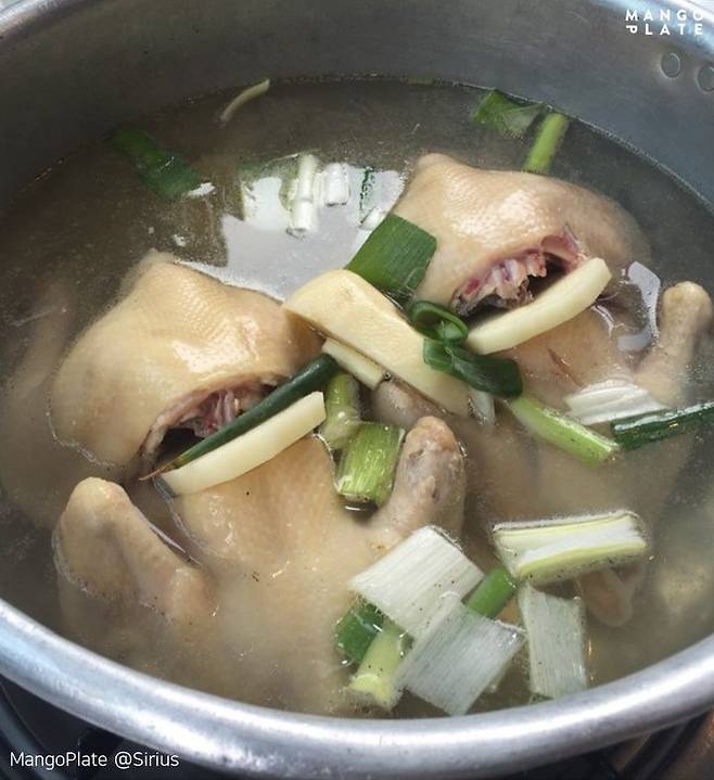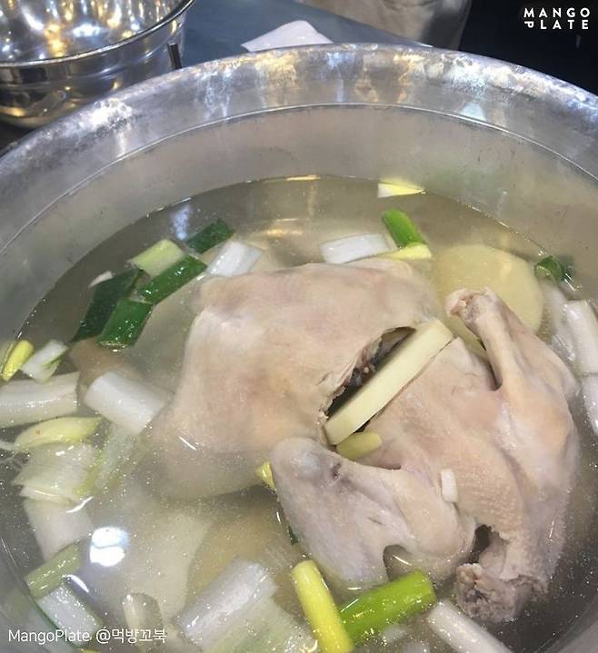 양푼에 담겨 나오는 닭 한 마리. 가운데는 감자가 꽂혀있는데요. 특별할 것 없어 보이지만, 영계를 한 번에 넣고 끓여낸 육수를 사용해 만든 진한 국물이 킥! 얼큰한 맛을 원한다면? 김치와 다진 양념을 넣어서 푹 끓여주면 돼요. 자신만의 양념 소스를 만들어 먹는 재미도 쏠쏠해요. 다 먹은 후, 국수로 마무리해줘야 제맛이지!