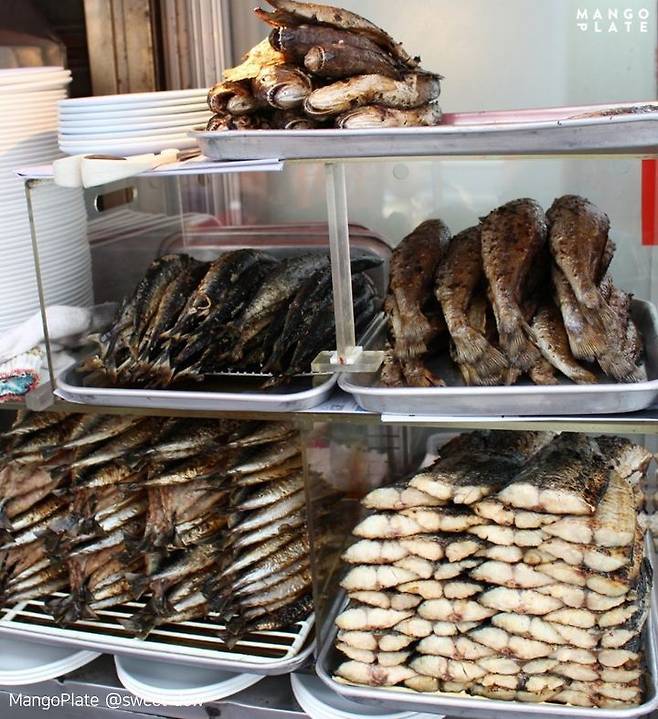 생선구이 골목은 아니지만, 종로 5가 신진시장 근처에 위치한 호남집을 소개할게요. 이곳은 1974년에 개업한 곳으로, 이 골목에서 가장 오래됐다고 해요. 이곳 역시 연탄불로 노릇노릇 구워내 겉은 바삭하지만 속은 촉촉한 생선구이를 맛보실 수 있을 거예요. 이곳에선 어떤 걸 먹어도 맛있지만, 임연수 생선을 추천해요. 노릇노릇 구워낸 생선 한 점을 흰 밥 위에 올려서 먹으면 얼마나 맛있던지! 가끔 이모님들께서 꽁치는 서비스로 주시기도 한다고! 푸근한 인심을 엿볼 수 있는 곳이랍니다.
