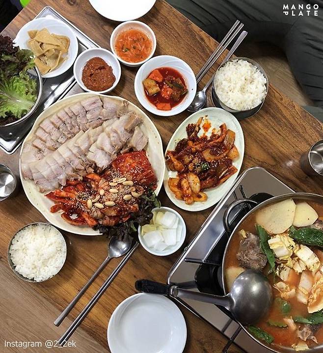 흥부가 역시 보쌈 골목에 위치한 식당이에요. 장군굴보쌈은 감자탕을 내어준다면, 이곳은 닭볶음탕과 감자탕 중에서 선택할 수 있어요! 수육은 다진 마늘과 소금을 넣은 사골 육수에 삶아 담백한 맛을 자랑하는데요! 매일 통영에서 조달한 신선한 굴과 보쌈은 환상의 궁합을 자랑한답니다.