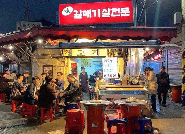다음은 광주집을 소개해요. 이곳에선 갈매기살, 삼겹살, 항정살, 막창구이 등 다양한 돼지 부속 고기를 맛볼 수 있는데요. 이 석쇠 불판, 참 특이하지 않나요? 갈매기 집 골목의 불팬은 수냉식 불팬으로 수증기 열로 고기를 구워내요. 그래서 고기가 탈 염려도, 연기가 날 염려도 없어요. 고기를 주문하면 김칫국과 청국장은 덤! 고기와 시원한 국물, 그리고 시끌벅적한 야장 분위기와 함께라면 술이 술술 들어갈 걸요?