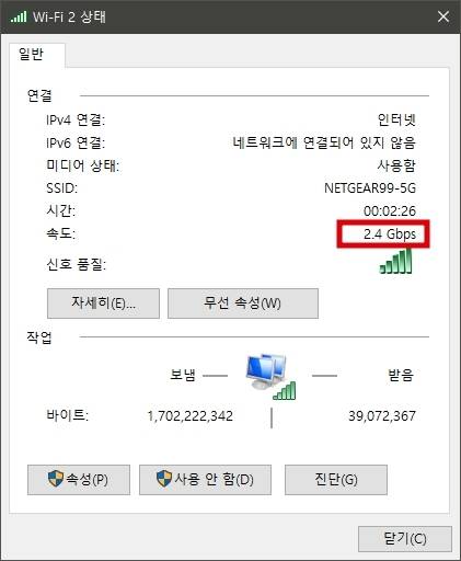 실제로 와이파이6 무선 랜카드를 장착한 2x2 노트북에서 링크 속도는 2400Mbps로 측정됐다. 여기에 160MHz 채널 대역폭이 적용돼 고속 통신 상황에서도 안정적인 성능과 속도를 보장한다.