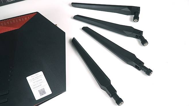 제품 구성은 일반 공유기와 크게 다르지 않다. 본체와 전원 어댑터, 4개의 고성능 안테나와 설치 가이드 및 제품 보증서가 박스에 담겼다. 인터넷 모뎀과 공유기를 연결하는 CAT.5e 랜선도 1개가 들어있다.