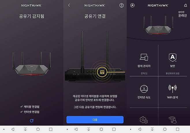 설치와 간단한 설정은 모바일 애플리케이션(앱) 나이트호크를 쓰면 된다. 이 앱은 기본적인 네트워크 구성과 상태를 모니터링할 수 있는 기능을 제공한다. 특히 초기 설치를 사진과 함께 단계별로 알려줘, 공유기 설치가 어려운 사용자라면 앱을 사용하는 편이 더 간단하다. 자세한 설정 방법은 제품 박스에 동봉된 가이드를 참고하면 된다.