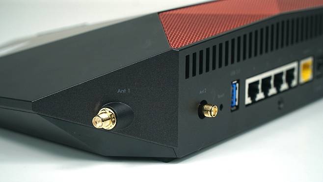 제품 뒤쪽은 유선 연결을 위한 포트들이 줄지어 있다. 왼쪽부터 USB 3.0, 이더넷 포트 4개, 인터넷(WAN) 포트, 어댑터 연결부와 전원 버튼 순이다. 랜선 포트는 모두 기가비트 규격이며, 최대 1Gbps 통신을 보장한다.