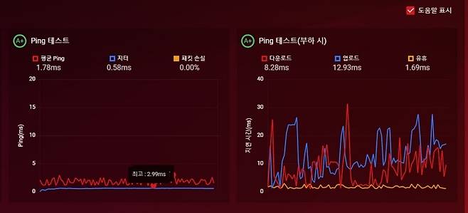 공유기 초기 설정을 마친 기본 상태에서 kt 기가 인터넷(500Mbps) 회선을 테스트했을 때 다운로드 속도는 평균 420Mbps를 유지했다. 핑은 대기 상태일 때 2ms였으며, 다운로드와 업로드 부하 상태일 때 핑은 평균 10ms~13ms로 측정됐다. 이는 다양한 스트리밍 영상을 재생하고 업로드하는 환경에서도 쾌적한 게임이 가능하다는 점을 보여준다. 업로드 대역폭이 중요한 고화질 인터넷 실시간 방송과 멀티플레이 게임을 동시에 해도 렉을 걱정하지 않아도 되는 수준이다.