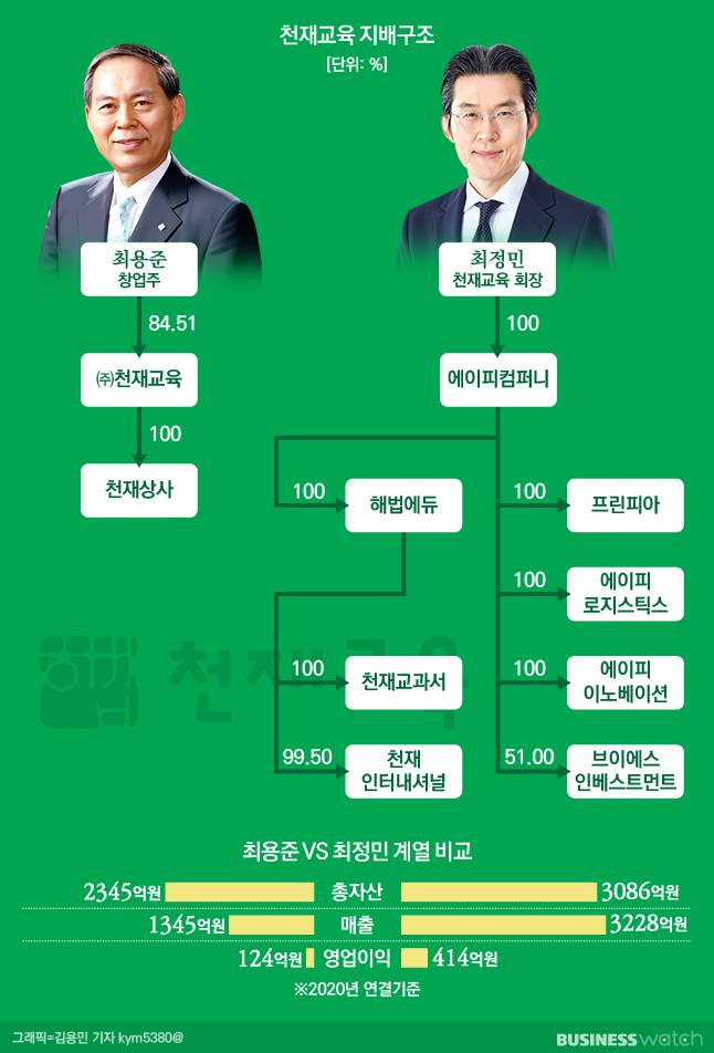 창업주는 이제 천재교육→천재상사 계열만을 직할 지배체제로 두고 있다. 지주회사 에이피(AP)컴퍼니를 정점으로 해법에듀, 천재교과서, 프린피아, 에이피로지스틱스, 에이피이노베이션 등 8개 계열사는 이미 황태자의 손에 쥐어져 있다.