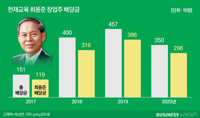 최 창업주가 남부러울 게 없는 ‘에듀리치’의 풍모를 가질 건 당연하다. 일례로 천재교육은 그간 버는 족족 쟁여놓았던 이익잉여금을 2017년부터 배당으로 풀기 시작했다. 작년까지 4년간 총 1360억원이다. 창업주가 거머쥔 배당금이 도합 1120억원이다.