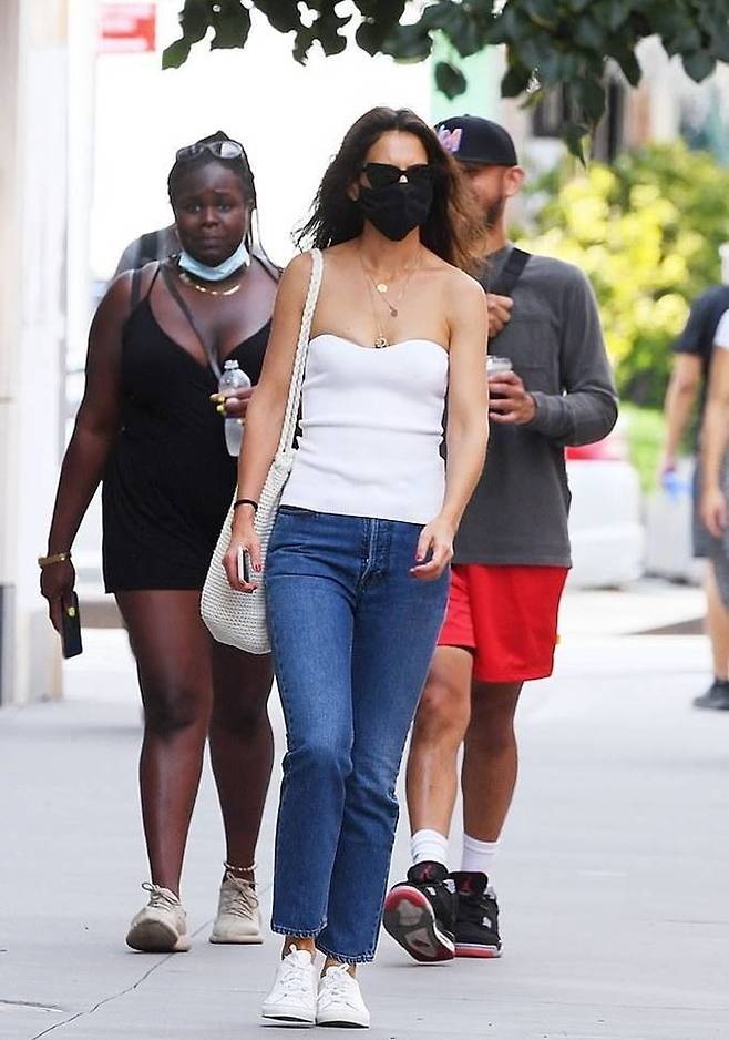 케이티 홈즈는 이날 코르셋 스타일의 슬리브리스 니트 탑과 청바지를 착용하고 여기에 화이트 스니커즈와 화이트 니트 토트백을 매치한 시원한 섬머룩을 선보였다.