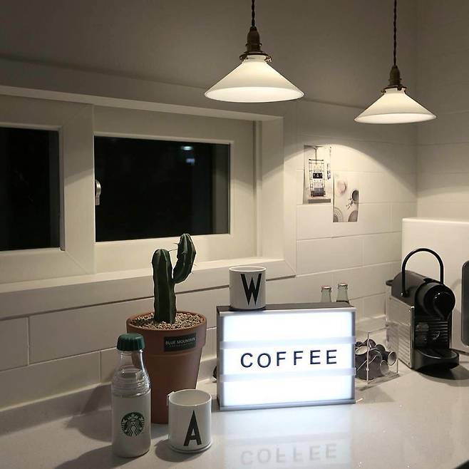 선인장 : 블루마운틴 / 알파벳컵 : 디자인레터스 / 텍스트조명 : 라이트박스 / 에스프레소머신 : 네스프레소