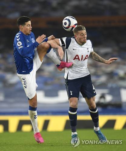 epa09140375 James Rodriguez (L) of Everton in action against Toby Alderweireld of Tottenham during the English Premier League soccer match between Everton FC and Tottenham Hotspur in Liverpool, Britain, 16 April 2021. EPA/Peter Powell / POOL EDITORIAL USE ONLY. No use with unauthorized audio, video, data, fixture lists, club/league logos or 'live' services. Online in-match use limited to 120 images, no video emulation. No use in betting, games or single club/league/player publications.