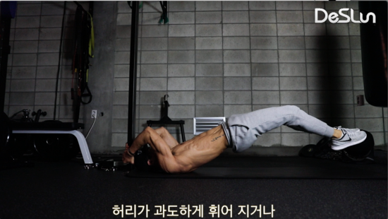 허리가 과도하게 휘어지거나. 몸통은 그대로 있고 다리만 먼저 올라오지 않게. 몸통과 다리가 곧게 뻗어 있는체로 내려갔다 올라 옵니다.
