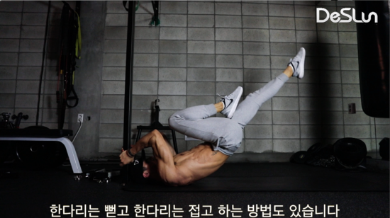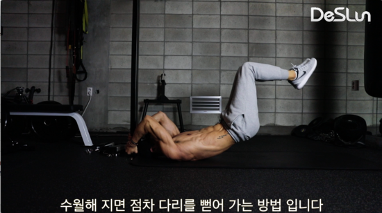 무릎을 접어 허벅지가 가슴에 닿게 자세를 잡고 시작하여 다리를 점차 멀리 뻗어내며 연습합니다.