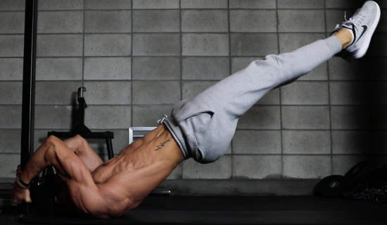단단한 고정물을 양손으로 잡고 등의 상부만 바닥에 닿아 있게 하고 다리를 위로 뻗어 줍니다.