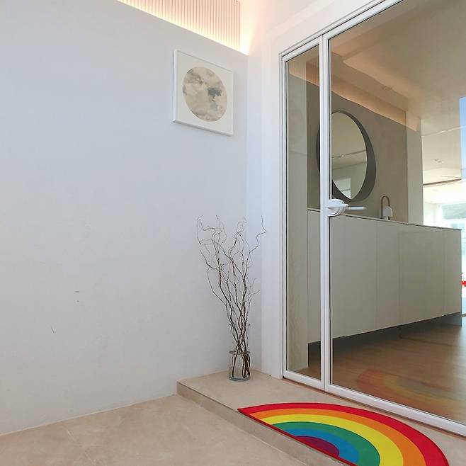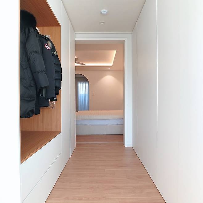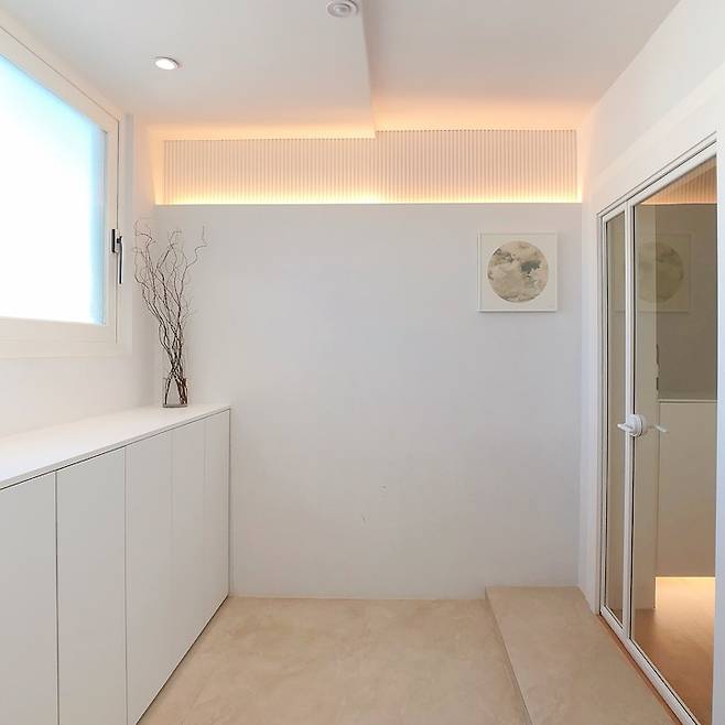이전보다 훨씬 더 밝아졌죠? 왼편 창문 아래는 수납장을 제작해 신발장으로 사용하고 있습니다. 현관에서 들어오면 천장 자동 센서등이 켜져 간접조명 역할을 합니다. 바닥은 베이지톤 포세린타일로 시공했어요. 오른편에는 중문을 설치하고 단을 올려 중문을 열고 나와 신발을 신을 수 있도록 만들었습니다.