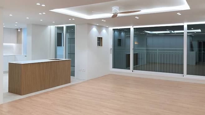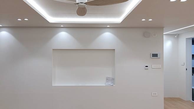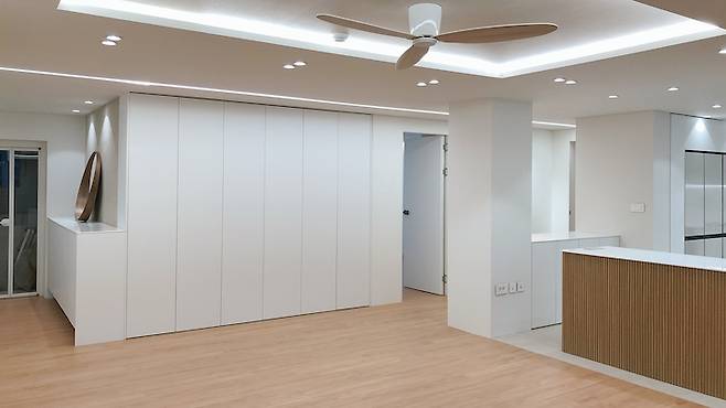 리모델링 공사 후 입주 청소를 하자마자 찍은 모습이에요. 기존에 베란다가 꽤 넓었는데 그 부분까지 확장을 하니 훨씬 넓어져서 좋더라고요. 천장도 전부 뜯어내고 목공사 진행하여 실링팬, 간접 조명 설치하였습니다. 거실 베란다 확장 후 양쪽(주방/입구방 쪽) 베란다와 연결된 공간은 모두 가벽을 사용해 막았습니다. 그리고 한쪽 벽은 중간에 작게 유리블럭 4개를 시공하였어요. 9개를 할까 고민했지만 지금 보면 4개만 넣길 잘했네요. 귀여운 느낌^^ 거실의 가장 큰 포인트는 액자같은 TV매립, 길게 이어진 라인조명, 벽처럼 보이는 거실수납장, 확장 후 넓게 쓰는 거실이에요.