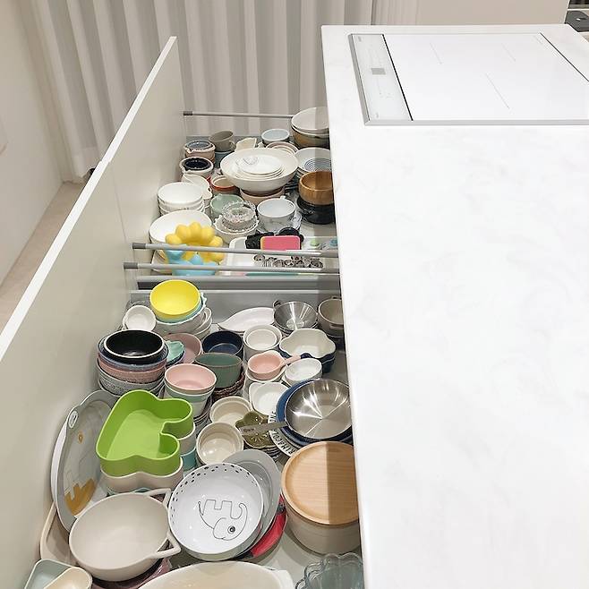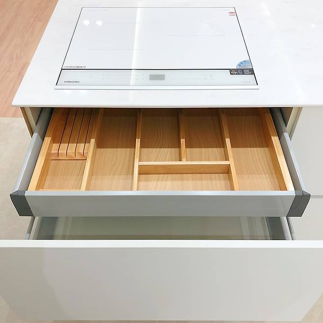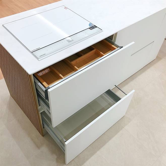 아일랜드는 큰 서랍 4개 + 여닫이 수납 형태로 제작했어요. 서랍레일은 전부 블룸으로 시공했습니다. 하는 일 특성상 그릇이 많은데, 많은 그릇을 수납해도 튼튼해요.