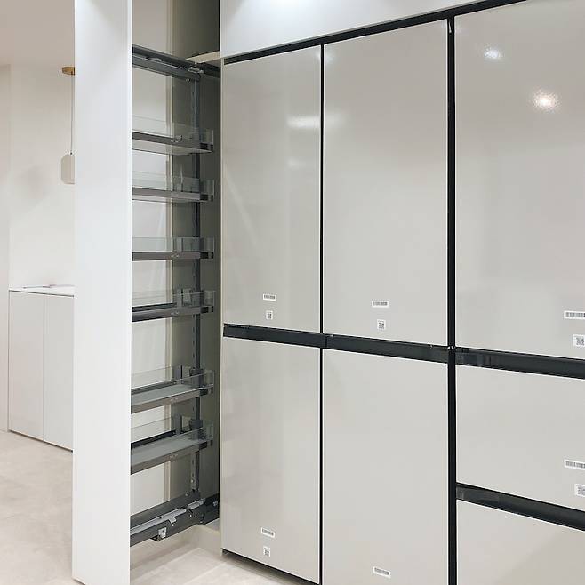 냉장고는 삼성비스포크 키친핏으로 구매했는데 역시 용량이 적긴 합니다. 공간부족으로 4도어 + 김치냉장고 조합으로 구성했는데 공간만 더 있었다면 1개 더 붙이고 싶었어요. 그래도 열심히 정리해가며 알뜰살뜰 공간활용 중입니다.