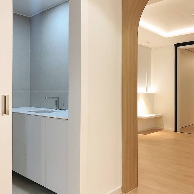 욕실문은 히든도어로 시공했어요. 문틀이 없어서 깔끔하죠.
