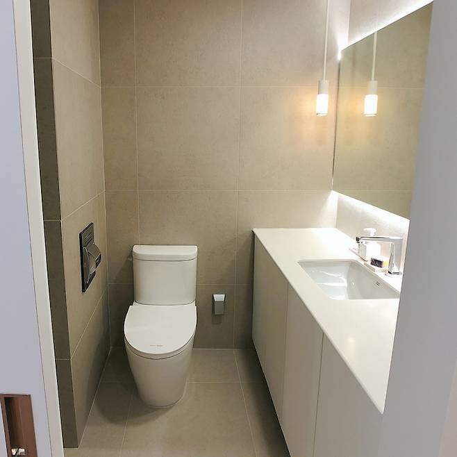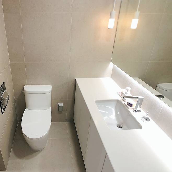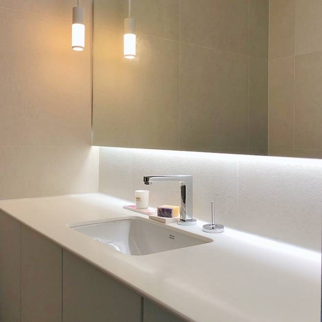 세면대는 벽 끝에서 끝까지 거울을 제작하여 설치하였고 그 덕분에 조금 더 넓어 보이는 효과가 있습니다. 언더카운터 형태로 수납장을 제작 후 설치하였어요. 수전같은 경우 투홀수전으로 설치하니 다들 백화점/호텔 화장실 같다고 하시더라고요. 욕실에 설치한 변기, 세면대, 샤워기, 수전 하나까지 전부 다 제가 직접 고른 제품들이랍니다.