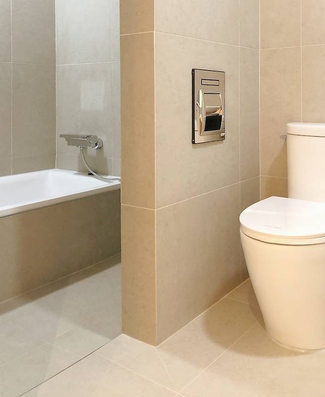 슬라이딩도어로 변경하니 이제 욕실 문을 열어도 세면대를 가리지 않아요. 욕조와 샤워기가 있는 공간은 기존에 유리부스가 있었는데 철거 후 조적벽을 설치했어요.
