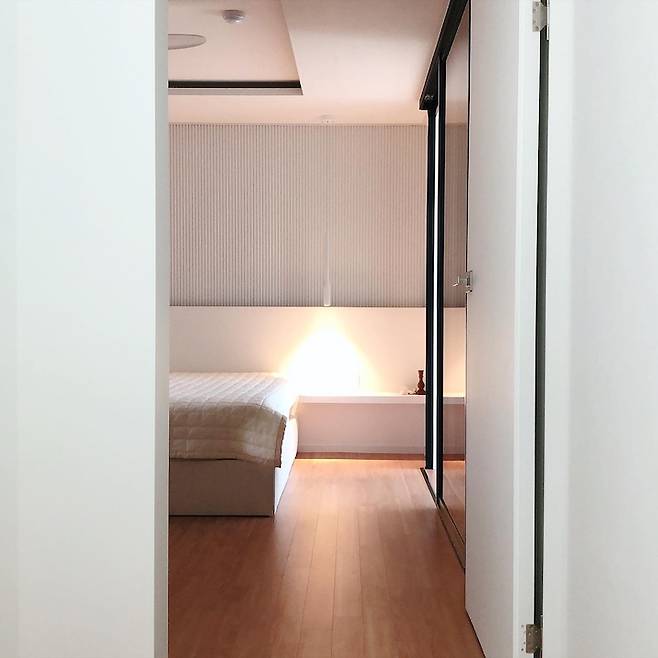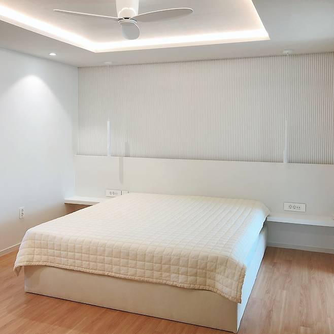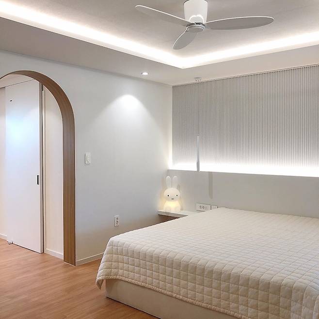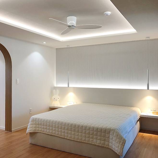 안방 침실 시공 후 모습이에요. 잠만 자는 곳이라 높은 조도가 필요 없어 최소한의 조명으로 아늑한 분위기를 만들었어요. 안방 침실의 포인트가 되는 부분은 바로 침대헤드 제작, 템바보드 시공, 파우더룸 아치형게이트 제작, 실링팬 설치랍니다.
