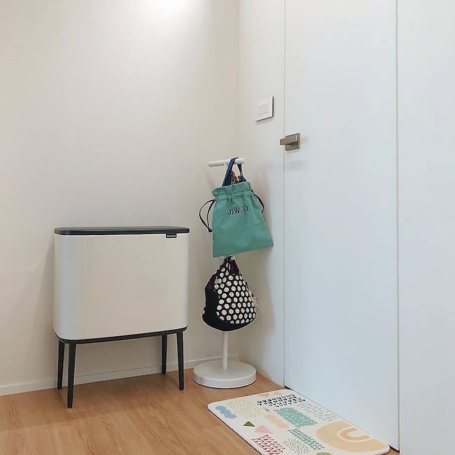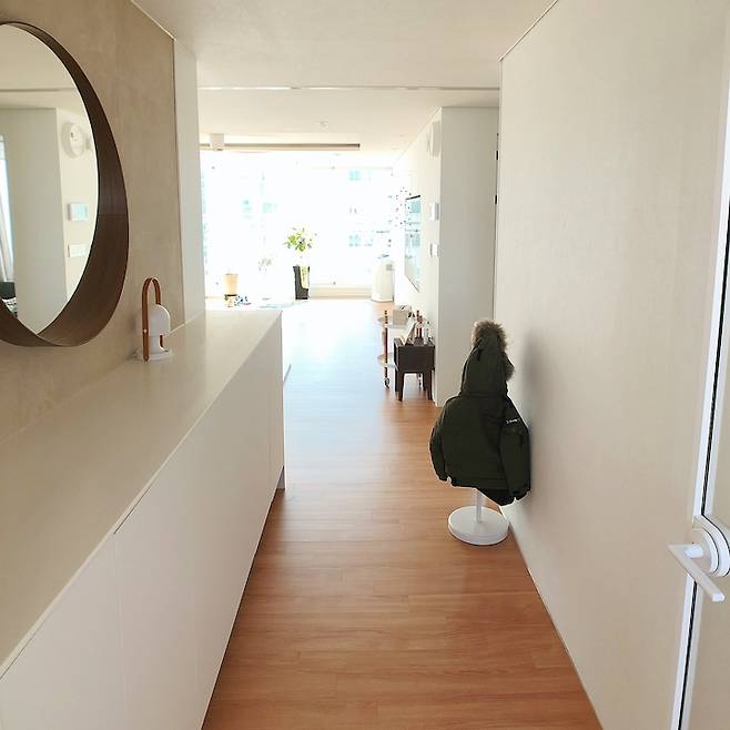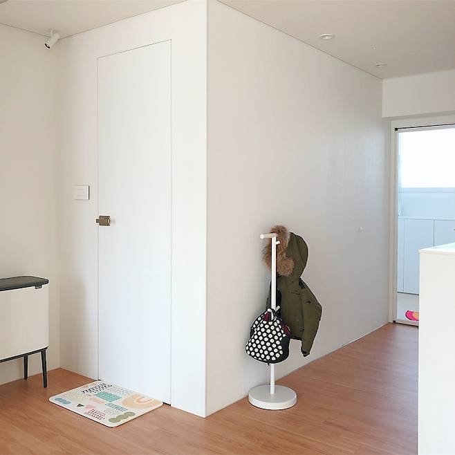 기존에 키 크고 어두운 신발장이 있던 공간은 철거 후 절반 높이의 수납장을 제작하고 우드톤의 거울을 달았습니다. 덕분에 빛이 더 많이 들어오는 느낌이라 집을 들어서면 환한 느낌으로 바뀌었어요. 원래는 여기까지 신발을 신고 들어왔으나 중문 설치 후 거실에서 중문까지 마루바닥을 연장하여 시공했습니다. 작은 행거를 두고 아이 옷이나 어린이집 가방을 걸어두곤 해요.
