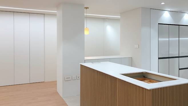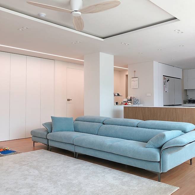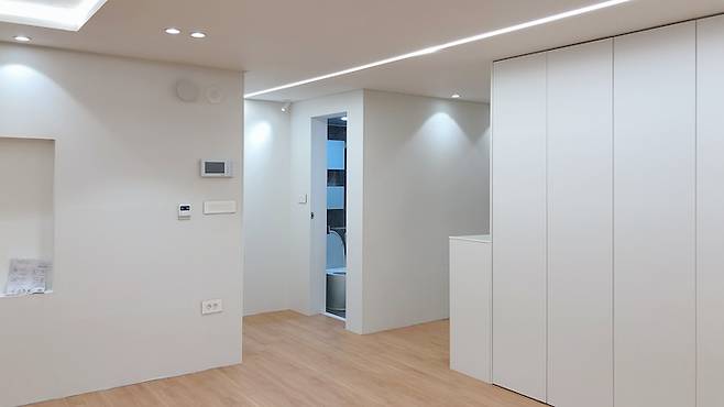 거실의 또 다른 포인트는 바로 천장에 위치한라인조명이에요. 거실 한 쪽 끝에는 공용욕실, 반대편 끝에는 안방침실이 있어요. 시작부터 끝까지 일자로 라인조명을 시공하였습니다. 조도확보와 함께 깔끔한 인테리어적인 효과도 더할 수 있었어요.