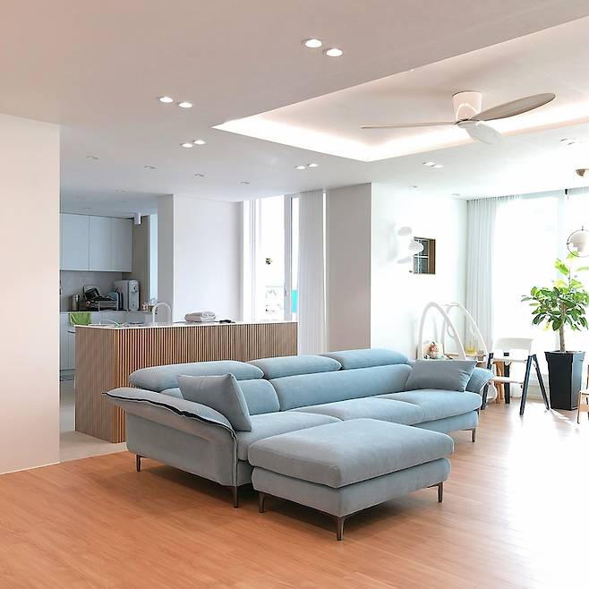 그리고 드디어 도착한 소파! 컬러는 아쿠아블루 컬러로 선택했어요. 요즘 유행하는 모듈소파를 살까 끝까지 고민했지만 저희 부부는 아무래도 등받이가 있어야 할 것 같더라고요. 근데 또 등받이가 너무 높으면 거실 전체가 답답해보이기에 등받이를 접을 수 있는 형태로 구매했답니다. 등받이를 접으면 그리 답답해 보이지 않아서 좋고, 등받이를 세우면 TV를 볼 때 편하게 볼 수 있어서 좋아요.