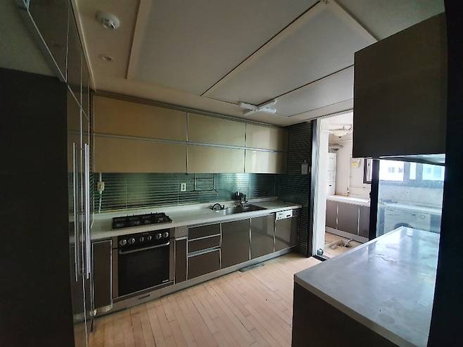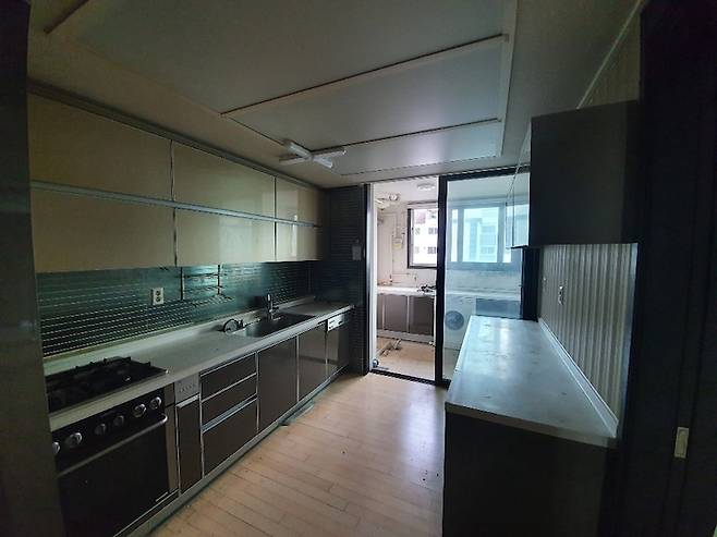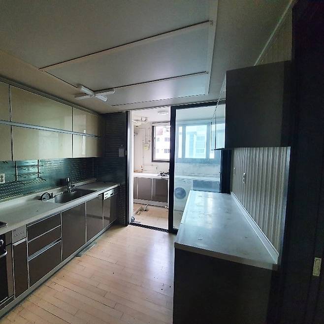 주방 안쪽은 일반적인 형태였으나 11자형으로 싱크대가 만들어져 있어 다소 답답했어요. 주방에서 세탁실로 나가는 샷시는 철거하기로 했습니다.