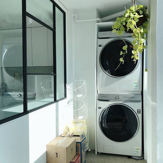 세탁실은 창 아래쪽으로 수납장 설치 후, 안쪽으로 삼성그랑데AI 세탁기+건조기를 구매, 설치하였습니다.