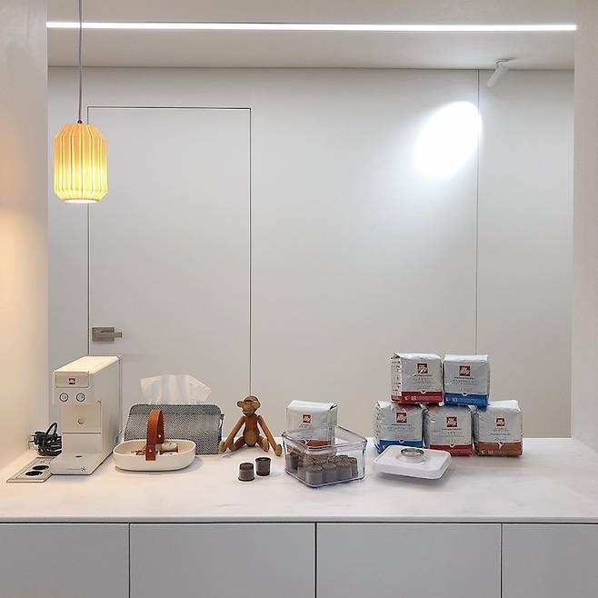 아일랜드 옆쪽에 있던 기존 기둥과 주방 내력벽 사이는 수납장을 설치하였어요.이쪽은 홈카페 공간으로 활용 중입니다. 각 상판마다 위에 매립형 콘센트를 설치하여 사용하기 편해요.