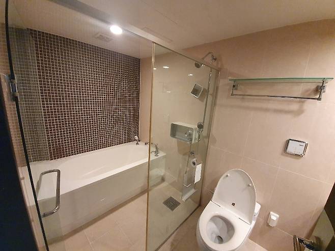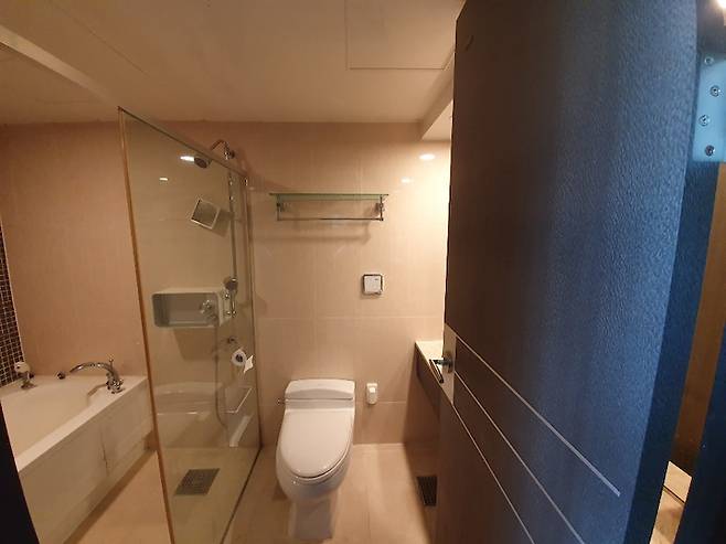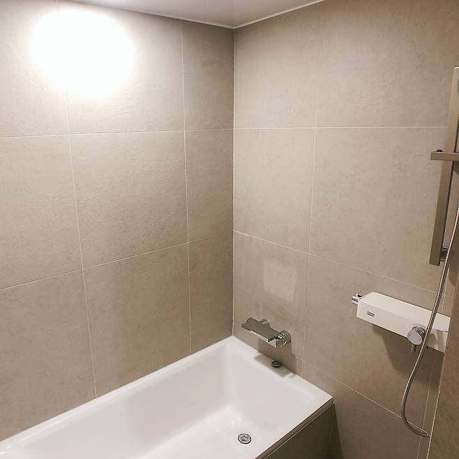 욕조+샤워기 공간과 변기+세면대 공간은 단차를 두고 사용 중입니다.