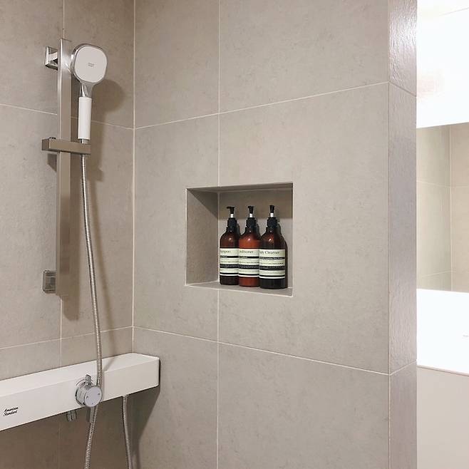 변기 쪽 조적벽엔 매립형 휴지걸이를, 샤워기 쪽 조적벽엔 매립선반을 만들어 샴푸 등을 올려두었어요.