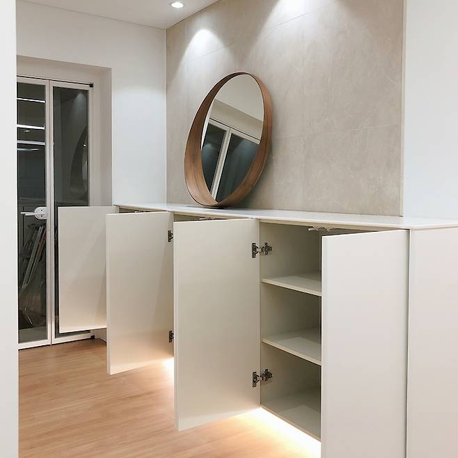 거실 수납장 내부와 중문 쪽 낮은 수납장 내부에요. 중문 쪽 낮은 수납장 하단에도 간접 조명을 설치하였고 센서를 설치해 사람이 지나가면 자동으로 불이 켜지도록 만들었어요. 어두운 밤 집을 나서거나, 집에서 들어올 때 아주 유용하답니다.