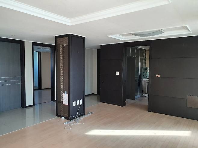 거실에는 기둥이 하나 있고 안쪽으로 주방이 있어요. 40평대 치고 주방이 다소 협소하긴 하더라고요. 가벽으로 막혀있어 더욱 답답한 느낌이었습니다. 이 가벽은 최대한 뜯어낸 후 주방을 조금 더 오픈형으로 바꾸었어요.