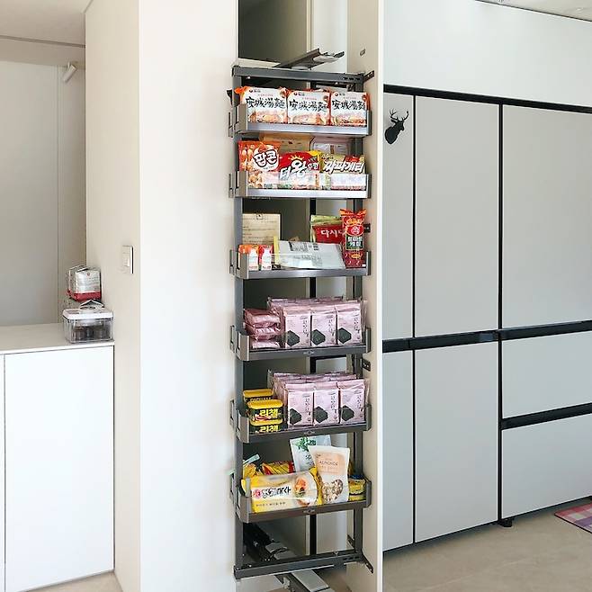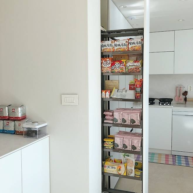 주로 김, 햄, 라면 등의 식재료를 보관 중이에요. 원래라면 손잡이를 달아야 하지만 틈으로 손을 넣어 열 수 있기 때문에 굳이 달지 않았어요. 생활하다가 정 불편하면 그때 달까 생각 중입니다.