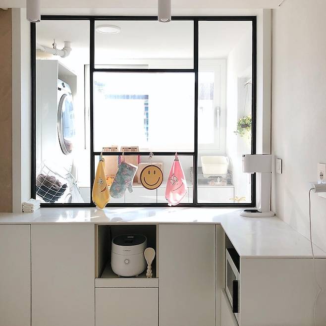 세탁실로 가는 샷시 철거 후 새롭게 탄생한 공간! ㄷ자형 싱크대에 커다란 창을 제작했어요. 주방 창은 철제로 만들어져 자석후크를 붙여두고 사용하고 있는데 편해요.